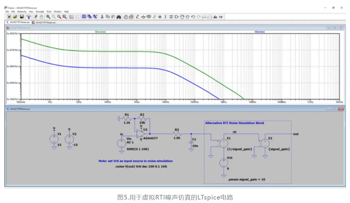 LTspice的多功能性和準(zhǔn)確性使其對噪聲仿真非常有用。輸出節(jié)點和輸入源在噪聲仿真命令中指定,輸出噪聲(RTO)是查看分析結(jié)果的默認(rèn)方式。LTspice還會根據(jù)RTI的傳統(tǒng)定義計算參考到指定輸入源的輸入噪聲,但如圖4所示,對傳統(tǒng)RTI噪聲進(jìn)行積分無法提供有意義的結(jié)果。圖5顯示了如何在LTspice的輸出中添加一級,以便仿真器返回替代的虛擬RTI噪聲。運(yùn)行仿真后,在選定圖形的情況下,從Plot Settings—Add Trace將輸入噪聲添加到圖形中,然后選擇V(inoise)。這會將輸入噪聲添加到圖形中。曲線形狀與輸出噪聲相匹配,表明整個電路的頻率響應(yīng)都得到了考慮。在按住ctrl鍵的同時左鍵單擊圖形中標(biāo)題為"V(inoise)"的曲線,以對總RTI噪聲進(jìn)行積分。