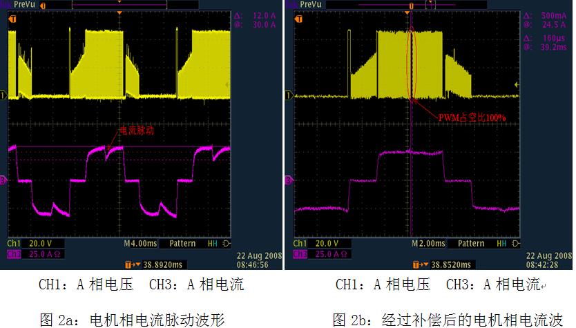 圖2b是采用XC866控制芯片的系統(tǒng)在經(jīng)過上述方法優(yōu)化后測得的換相電流波形,由圖2b可以看出,換相時的電流脈動基本消除,電機的相電流基本接近方波。用了這套控制系統(tǒng)的電動車,起步加速以及運行時的電機震動已基本消除,實現(xiàn)了超靜音控制器的設(shè)計。