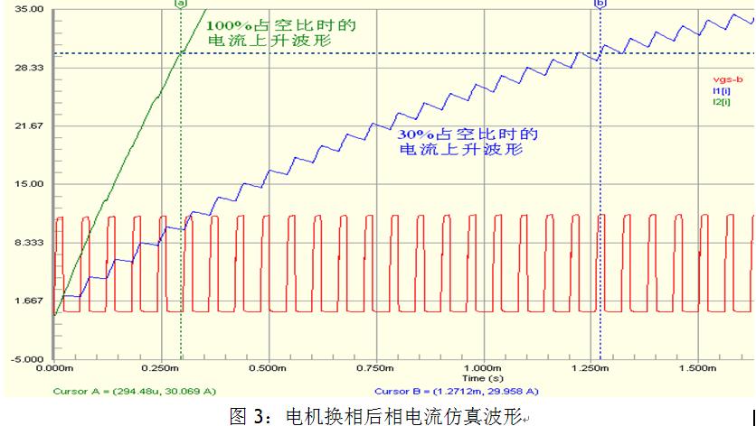 由于在低速大負載運行時,電機的旋轉(zhuǎn)反電勢很小,為了使電機的相電流不超過允許的最大值,PWM占空比通常比較小,這使得換相后新的相繞組電流上升緩慢。圖3中是電機換相時的電流仿真波形。電機兩相之間的電感為Lm=0.4mH,內(nèi)阻Rm=0.28歐姆(實際電機的參數(shù))。采用AOS(萬代半導(dǎo)體)生產(chǎn)的AOT460 MOSFET進行仿真。MOSFET的PSPICE模型采用level3等級。由圖3中可以看出,如果PWM占空比為30%,則電流由零上升到30A需要約1.3ms。這與圖2a中實測的波形相仿。為了使換相后電流迅速上升,我們可以使換相后PWM占空比為100%來對電流進行補償,直到電流上升到換相前的電流值,這樣可以使換相電流的波動盡可能的小,時間盡可能地短。由仿真波形中I2可以看出,電流上升到30A的時間小于300us。