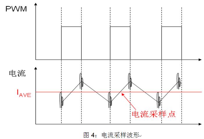2) 能夠在PWM的開通期間特定時刻觸發(fā)A/D采樣;因為在PWM逆變器帶感性負載的控制系統(tǒng)中,由于系統(tǒng)的一些寄生參數(shù)導(dǎo)致PWM在開通和關(guān)斷期間電機的相線上出現(xiàn)振鈴(如圖4所示),這些振鈴會耦合到A/D采樣的回路中,因此我們應(yīng)避開在PWM開關(guān)過程中進行A/D采樣。如果我們在PWM開通期間的中點觸發(fā)電流采樣,我們將會得到電流的平均值,這將有利于我們對電流補償?shù)目刂啤?