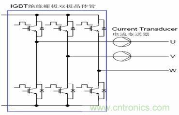 功率開(kāi)關(guān)器件通過(guò)根據(jù)來(lái)自微處理器板的控制信號(hào)控制大功率輸出器件的關(guān)斷和導(dǎo)通,來(lái)實(shí)現(xiàn)對(duì)交流電機(jī)的輸出電流和電壓的控制。根據(jù)控制方式的不同,其輸出方式由方波輸出逐漸發(fā)展到PWM輸出或SPWM輸出。開(kāi)關(guān)器件也由原來(lái)的GTR,MOSFET,發(fā)展到IGBT,IPM等。參見(jiàn)下面的典型IGBT逆變輸出電路。