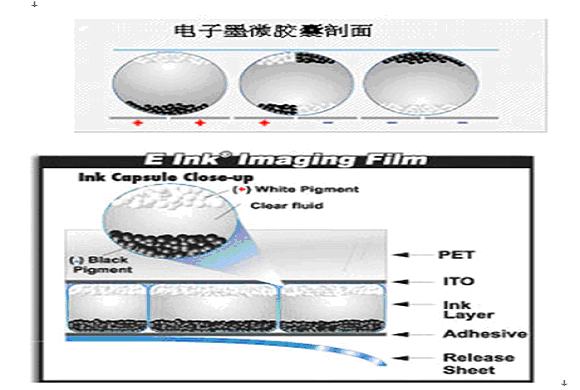 E-Ink的電子紙由電子墨水及兩片基板所組成:第一部分是電子墨水,有時(shí)被稱為“前基板(front plane)”;二是使電子墨水生成文本和圖像所需要的電子設(shè)備組合,包括控制部分和顯示部分,被稱為“背基板(backplane)”。背基板上面涂有由無數(shù)微小的透明顆粒組成的電子墨水,顆粒直徑只有人的頭發(fā)絲的一半大小。電子墨水是一種加工成薄膜狀的專用材料,與電子顯示設(shè)備結(jié)合在一起使用,是化學(xué)、物理學(xué)和電子技術(shù)的綜合應(yīng)用。電子墨水由數(shù)百萬個(gè)尺寸極小的微膠囊構(gòu)成,直徑與頭發(fā)絲相當(dāng)。每一個(gè)微膠囊中含有帶正電荷的白色粒子和帶負(fù)電荷的黑色粒子,它們懸浮在清潔的液體中。 如圖1所示,電子墨水薄膜的頂部是一層透明材料,作為電極端使用;底部是電子墨水的另一個(gè)電極,微膠囊夾在這兩個(gè)電極間。微膠囊受負(fù)電場作用時(shí),白色顆粒帶正電荷而移動到微膠囊頂部,相應(yīng)位置顯示為白色;黑色顆粒由于帶負(fù)電荷而在電場力作用下到達(dá)微膠囊底部,使用者不能看到黑色。如果電場的作用方向相反,則顯示效果也相反,即黑色顯示,白色隱藏。可見,只要改變電場作用方向就能在顯示黑色和白色間切換,白色部位對應(yīng)于紙張的未著墨部分,而黑色則對應(yīng)著紙張上的印刷圖文部分。
