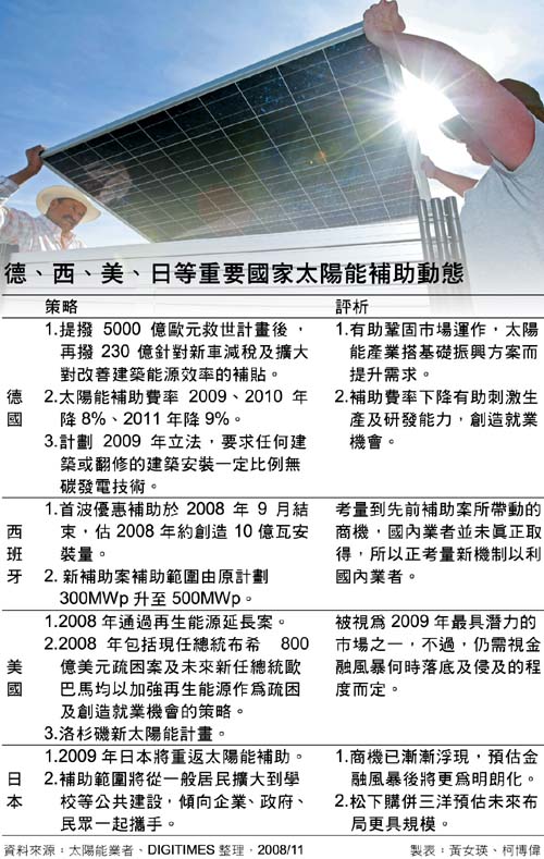 搭配各州政府自己擬定的太陽(yáng)能補(bǔ)助政策及聯(lián)邦政府延長(zhǎng)的太陽(yáng)能補(bǔ)助案,目前全美有許多州都在擬定這類的太陽(yáng)光電補(bǔ)助計(jì)劃,其中又以加州最積極;似乎一切都就緒,就等待金融風(fēng)暴落底。