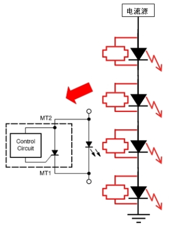如前所述,LED是一種使用壽命極長的光源(可長達5萬小時)。除了需要針對具體的LED應(yīng)用選擇適合的LED驅(qū)動解決方案,還需要為LED提供適當(dāng)?shù)谋Wo,因為偶爾LED也會失效。其原因多種多樣,可能是因為LED早期失效,也可能是因為局部的組裝缺陷或是因瞬態(tài)現(xiàn)象導(dǎo)致失效。必須對這些可能的失效提供預(yù)防措施,特別是因為某些應(yīng)用屬于關(guān)鍵應(yīng)用(故障停機成本高),或是安全攸關(guān)的應(yīng)用(如頭燈、燈塔、橋梁、飛行器、飛機跑道等),或是在地理上難于接近的應(yīng)用(維護困難)等。在這方面,可以采用安森美半導(dǎo)體的NUD4700 LED分流保護解決方案。圖5是這種分流保護解決方案的應(yīng)用及原理示意圖。