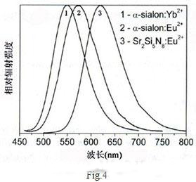 2007年日本材料科學(xué)研究所納米陶瓷中心得到的結(jié)果是最高的[3],他們采用中心波長(zhǎng)為450nm的InGaN藍(lán)光LED和光子轉(zhuǎn)換效率高、在450nm藍(lán)光范圍 有強(qiáng)吸收峰、溫度系數(shù)低的三種熒光粉進(jìn)行了試驗(yàn),這三種熒光粉分別為:α-sialon: Yb2+、α-sialon: Eu2+和Sr2Si5 N8: Eu2+。這些熒光粉的特點(diǎn)是發(fā)光效率的熱衰減較小,在