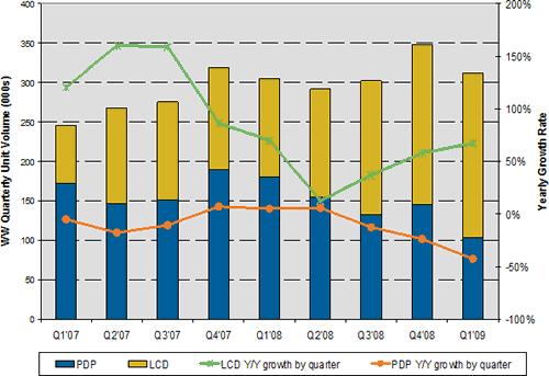 圖一 Q1’09全球26寸及以上尺寸公眾顯示器出貨量與成長(zhǎng)率 - 按液晶與等離子顯示器區(qū)分