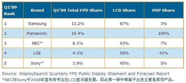 有部分品牌廠商在2008年停止采用等離子面板做為公眾顯示系統(tǒng)應(yīng)用,對(duì)于等離子陣營(yíng)造成了一些傷害;不過(guò)主要等離子廠商如Panasonic仍是非常專注于等離子面板于公眾顯示領(lǐng)域的應(yīng)用,我們相信這些主要廠商的投入,對(duì)于等離子未來(lái)在公眾顯示領(lǐng)域的發(fā)展仍會(huì)有一定影響力。根據(jù)DisplaySearch第一季出貨調(diào)查指出,Samsung為整體公眾顯示器不分技術(shù)別出貨冠軍,而Panasonic排名第二,不過(guò)Samsung主要是采用液晶顯示器,而Panasonic則100%采用等離子顯示器。
