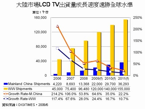中國大陸LCD TV出貨增長速度遠(yuǎn)高于全球平均水平(資料來源:DIGITIMES Research,2009年6月)