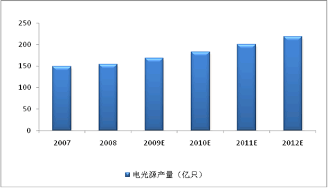 中國電光源(燈泡)行業(yè)能夠持續(xù)快速穩(wěn)定的發(fā)展,其中很重要的原因是產(chǎn)品面向國際和中國兩大市場(chǎng)。在中國和國外消費(fèi)市場(chǎng)推動(dòng)下,2008年中國電光源產(chǎn)量達(dá)154億只,較2007年同比增長(zhǎng)3.5%。隨著中國電光源質(zhì)量和技術(shù)標(biāo)準(zhǔn)的提升,預(yù)計(jì)未來中國電光源產(chǎn)量增長(zhǎng)率將為維持9%-12%之間。