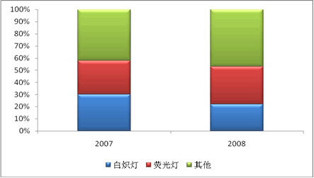 圖:2007-2008年中國電光源市場(chǎng)結(jié)構(gòu)比例圖