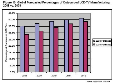 iSuppli早先預計2008年35.2%的LCD-TV將外包給合同制造商,但結果是外包出去的LCD-TV僅占28.7%。