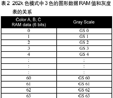 這一單一的灰度表適用于三子色,脈寬的數(shù)值由軟件指令輸入。在262k模式,每一顏色包含6-bit,因在262k模式,每一顏色包含6-bit,因此每一顏色都有64階灰度(如表2所示)。