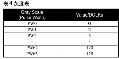 全彩顯示對每一個RGB原色分量提供6-bit,即64級灰度,通過電流驅(qū)動階段列驅(qū)動的脈寬調(diào)制(PWM)設(shè)置不同的灰度級?;叶缺砑礊榇鎯α藢?yīng)64級灰度(GS0~GS63)的PWM(PW0~PW63)的值。脈寬越寬,象素顯示越亮。因此,每個象素的顯示亮度由灰度表中的脈寬值決定。
