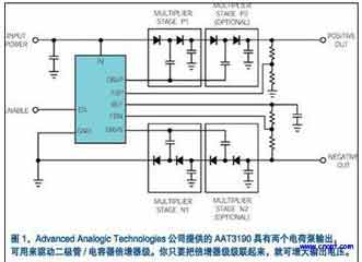 AdvancedAnalogicTechnologies公司的副總裁JanNilsson評述道:“許多手機、數(shù)碼相機及其它便攜式設(shè)備中的有源矩陣LCD和OLED……子系統(tǒng)要求正負兩種小電流偏置電源。”這種情況使得電源前景復(fù)雜化。AdvancedAnalogicTechnologies公司推出的AAT3190能滿足這種需求,因為它借助一塊采用自同步雙電荷泵體系結(jié)構(gòu)其工作于標稱1MHz的開關(guān)頻率芯片來生成正負兩種電源(圖1)。這種電荷泵可利用2.7V~5.5V的單極性輸入電源產(chǎn)生最大可達±25V的可調(diào)輸出電壓。