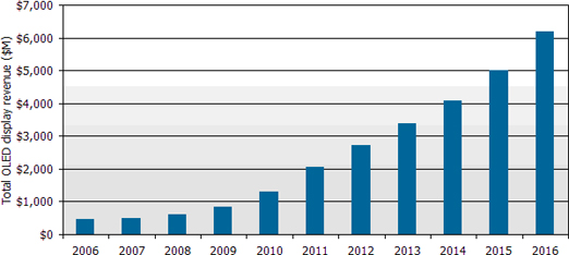 根據(jù)DisplaySearch最新發(fā)表季度OLED(有機發(fā)光二極管顯示器)出貨報告指出,第二季全球OLED出貨金額創(chuàng)新高達(dá)1億9千2百萬美元,較上一季成長32%,與去年同期相比成長22%。DisplaySearch預(yù)測全球OLED產(chǎn)值將從2008年6億美元,按每年33%復(fù)合成長率成長,估計到了2016年整體產(chǎn)值將達(dá)到62億美元;其中手機主屏仍是最主要的應(yīng)用,2016年出貨金額估計為30億美元,同時OLED TV產(chǎn)值將達(dá)20億美元,成為OLED第二大應(yīng)用產(chǎn)品。
