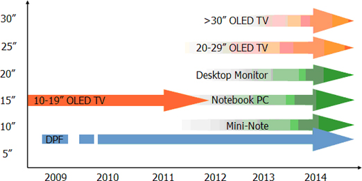 隨著技術(shù)進(jìn)步,DisplaySearch預(yù)估AMOLED將進(jìn)一步朝中大尺寸方向發(fā)展。筆記本計算機將是AMOLED廠商下一個關(guān)注的應(yīng)用方向,我們估計自2010年年中,廠商將有機會將AMOLED應(yīng)用在筆記本計算機上,而采用AMOLED面板上網(wǎng)本將有機會于2010年底開始量產(chǎn)。在TV方面,我們預(yù)期2010年底將會有大于20寸AMOLED TV被生產(chǎn),同時預(yù)期2011年大于30寸AMOLED TV 將會進(jìn)入市場中。