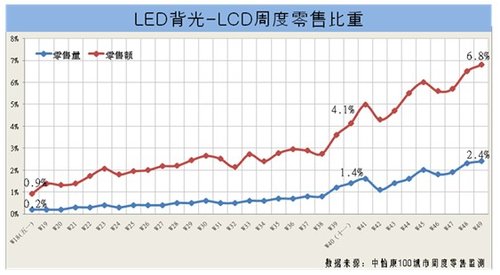 - LED背光電視零售額占整體液晶電視的比重已經(jīng)從五一期間的0.9%增長(zhǎng)到目前的6.8%