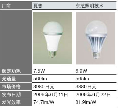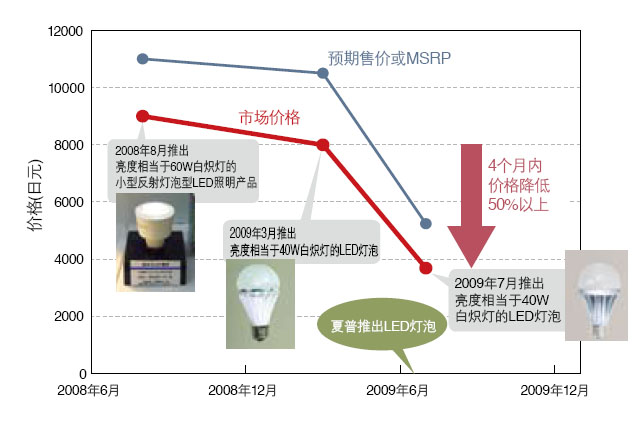 2008年,夏普公司以低價(jià)策略進(jìn)軍LED照明市場(chǎng)。2009年6月,該公司發(fā)布了一款全新的LED燈泡,其市場(chǎng)價(jià)格約4000日元,僅為同類(lèi)競(jìng)爭(zhēng)產(chǎn)品的一半,推出后立即在市場(chǎng)上掀起了一股強(qiáng)勁的沖擊波。夏普公司的這款低價(jià)產(chǎn)品迫使東芝照明技術(shù)于2009年7月推出亮度相當(dāng)于60W白熾燈的LED燈泡,其廠商建議零售價(jià)約為5000日元,市場(chǎng)價(jià)格約為4000日元。與4個(gè)月前東芝推出的同類(lèi)產(chǎn)品相比,價(jià)格大幅下降了50%(見(jiàn)圖1和表1)。