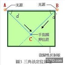 大型觸控面板採「光線遮蔽方式」,圖3是光學(xué)式大型觸控面板應(yīng)用三角法定位原理的動作原理,如圖所示,若知道A-B之間的距離、A點的夾角d,以及B點的夾角,就能夠確定C點的位置,A-B之間的距離為已知數(shù),只要確定A點的夾角與B點的夾角即可。