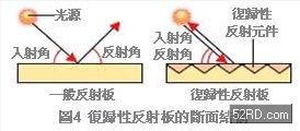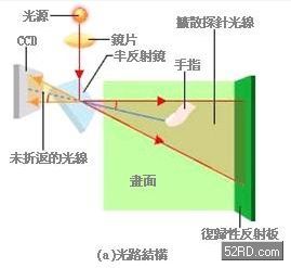 此時若在顯示器周圍設(shè)置復(fù)數(shù)個收光器,勢必會造成觸控面板制作成本暴增,有鑑于此,研究人員在顯示器周圍黏貼「復(fù)歸性反射板(ReturnReflectorSheet)」,它可以反射來自顯示器周圍任何方向的光線,亦即從感測器射出的任何光線都會折返至感測器,如果被筆或是手指遮蔽時,光線就不會折返至感測器(圖4)。