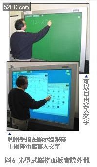 光學(xué)式觸控面板的設(shè)計必須考量雷射光線對人眼的安全,因此採用低功率半導(dǎo)體雷射,然而低功率半導(dǎo)體雷射卻會引發(fā)復(fù)歸光量不足等現(xiàn)象。此外,CCD會同時擷取燈泡與太陽等外部光線,必需透過軟體的信號處理技術(shù)克服。圖6是光學(xué)式觸控面板實際外觀。一般認為,大型光學(xué)式觸控面板非常適合應(yīng)用在教育、運動以及各種商務(wù)簡報等領(lǐng)域。
