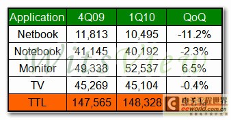 根據(jù)市場研究機構(gòu)WitsView 的統(tǒng)計,2010年第一季全球大尺寸TFT-LCD面板整體出貨,延續(xù)去年第四季的成長動能,總出貨量增加至14,832萬片,不斷刷新面板歷史出貨高點,更創(chuàng)下連續(xù)五季正成長的紀錄。雖然出貨季成長僅0.5%,但和去年同期相比,亦有高達71.9%的傲人成長。