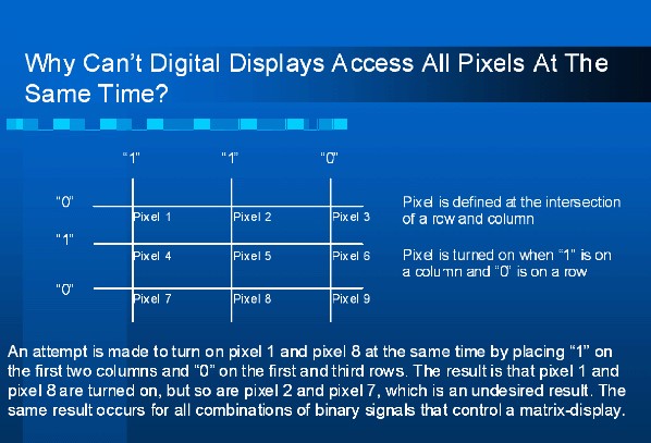 由于存在上述數(shù)位控制的問(wèn)題,畫(huà)素級(jí)的多線定址方法一直是類比式的。影像數(shù)據(jù)在處理器中仍以數(shù)位方式處理,但採(cǎi)用影像分解方法將影像分解成行列數(shù)據(jù),然后再以數(shù)位類比轉(zhuǎn)換器(DAC)轉(zhuǎn)換成類比訊號(hào)。類比的行與列訊號(hào)通常是OFDM載波,而行與列訊號(hào)中的每個(gè)頻率元件代表顯示器中單一畫(huà)素的控制?!?br />