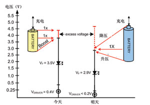 未來(lái),新型鋰離子電池和LED技術(shù)將會(huì)為L(zhǎng)ED驅(qū)動(dòng)帶來(lái)新的挑戰(zhàn)。配合最新的化學(xué)成果,電池電壓的范圍將擴(kuò)大到2.3~4.7V,而典型的白光LED正向電壓將會(huì)下降至2.9V。與此同時(shí),輸出驅(qū)動(dòng)器的飽和電壓都會(huì)隨著下降。當(dāng)采用并聯(lián)驅(qū)動(dòng)時(shí),要高效地驅(qū)動(dòng)一個(gè)2.9V的LED,就需要?jiǎng)佑靡粋€(gè)升降壓轉(zhuǎn)換器。圖2所示為由電池、驅(qū)動(dòng)器和LED技術(shù)的進(jìn)步所帶來(lái)的效果。