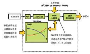 使用RGB背光時(shí),當(dāng)LED溫度改變時(shí),驅(qū)動(dòng)器必須更正紅、綠和藍(lán)三主色間的亮度平衡,以防出現(xiàn)白點(diǎn)位移。此外,還需保證驅(qū)動(dòng)器在任何操作溫度下維持光的正確強(qiáng)度。而在補(bǔ)償方面,可以用閉環(huán)或開環(huán)形式。若使用閉環(huán)補(bǔ)償,便需采用感光器來(lái)測(cè)量白點(diǎn)和其強(qiáng)度。相反地,如使用開環(huán)補(bǔ)償,那溫度便需事先量度出來(lái),并通過(guò)預(yù)先定義好的補(bǔ)償曲線來(lái)調(diào)節(jié)亮度的平衡。