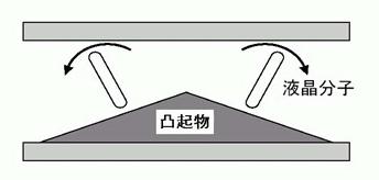 如圖,它依*叫做Protrusion的屋脊狀凸起物來使液晶本身產(chǎn)生一個預(yù)傾角(Pre-tiltAngle)。這個凸起物頂角的角度越大,則分子長軸的傾斜度就越小。早期的VA模式液晶凸起物只在一側(cè),後期的MVA凸起物則在上下兩端。