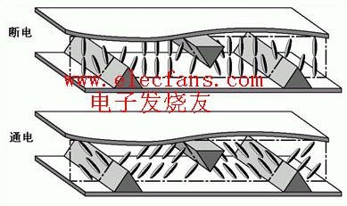 如圖是一種雙疇VA模式液晶。未加電時,液晶分子長軸垂直於螢?zāi)?,只有?近凸起物電極的液晶分子略有傾斜,光線此時無法穿過上下兩片偏光板。當加電後,凸起物附近的液晶分子迅速帶動其他液晶轉(zhuǎn)動到垂直於凸起物表面狀態(tài),即分子長軸傾斜於螢?zāi)?,透射率上升從而實現(xiàn)調(diào)制光線。在這種雙疇模式中相鄰的疇分子狀態(tài)正好對稱,長軸指向不同的方向,VA模式就是利用這種不同的分子長軸指向來實現(xiàn)光學補償。如圖,在B處看到的是中灰階,在A和C處能同時看到的高灰階和低灰階,混色後正好是中灰階。