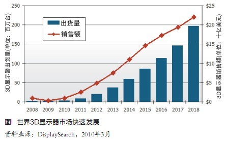 市場研究公司DisplaySearch日前發(fā)表一份專門報告稱,在3D電影成功的促動下,3D顯示器市場將于2010年開始起飛,預測3D顯示器出貨量將從2008年的70萬個增長到2018年的1.96億個,10年內年均增長率達75%,同期銷售額從9億美元增長到220億美元,年均增長率38%(圖1)。世界消費電子廠商將隨著推出一批3D有關產品,包括電視機、監(jiān)視器、筆記本電腦、藍光盤播放器、數碼相機、攝像機、相框等進軍家庭市場。加上立體顯示原來就有的醫(yī)療等專業(yè)應用以及廣告、公共顯示牌等應用,都會成為促動顯示產業(yè)開始從平板產品向著3D大進軍,這也是一次從平板顯示轉向立體顯示的革命。