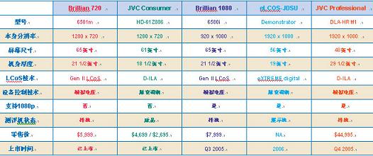 每個(gè)參與測(cè)評(píng)的制造商資料請(qǐng)?jiān)斠?jiàn)后面的高清電視制造商介紹,表1顯示了每種機(jī)型的基本信息,注意表中型號(hào)是以分辨率按字母順序排列的。JVCConsumer價(jià)格有兩個(gè)來(lái)源都列在表上,一個(gè)是制造商建議零售價(jià),另一個(gè)是我在市場(chǎng)上能找到的最低實(shí)際售價(jià),其它都將以表中所列價(jià)格即將在市面上發(fā)售。