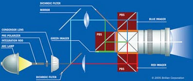 LCoS的基本原理是在液晶層后面用一個(gè)鏡子,光線從前面進(jìn)來(lái)后穿過(guò)液晶層,經(jīng)過(guò)鏡子反射再次穿過(guò)液晶層射到屏幕上。這需要稍微復(fù)雜一些的光學(xué)部件,但確實(shí)非常有用,它有幾個(gè)直接明顯的優(yōu)點(diǎn),如所有電子部件都在鏡子后面,完全在光路以外。在它后面有很大空間,這樣就可能達(dá)到難以置信的高分辨率,LCoS在所有顯示技術(shù)中分辨率最高。另外因光線兩次穿過(guò)液晶,可以達(dá)到很高對(duì)比度但依然非常薄,從而大大改善響應(yīng)時(shí)間減少拖影。我們將在第三部分討論LCoS的優(yōu)點(diǎn)和缺點(diǎn)。