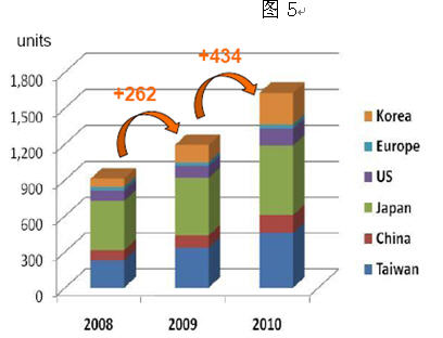 晶粒方面,預(yù)估全球MOCVD數(shù)量逐步增加(圖5),其中以韓國和臺灣廠商最為積極,Samsung, LG Innotek以及AUO旗下的Lextar都將增加MOCVD機(jī)臺數(shù)量至目前的2~3倍。到2010年底,預(yù)計(jì)全球高亮度LED晶粒月產(chǎn)能將接近200億,但目前市場應(yīng)用仍以移動終端產(chǎn)品和汽車照明用為主,前兩者的應(yīng)用比重高達(dá)55%,但TV用背光源應(yīng)用比重總體仍將難突破20%,因此背光源缺貨狀況的緩解將需要較長時間。