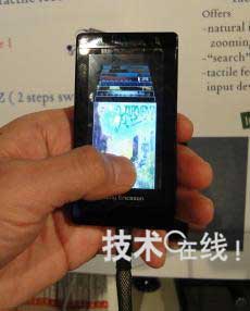 圖1:配備了試制的觸摸面板的樣機(jī)。運(yùn)算處理由與小型影像顯示設(shè)備相連接的個(gè)人電腦等進(jìn)行。用戶碰觸觸摸面板的力度越強(qiáng),畫(huà)面上顯示的圖標(biāo)切換速度就越快。另外,照片中拍到的圖標(biāo)為上下方向切換。影像顯示設(shè)備中有“Sony Ericsson”字樣的標(biāo)記。