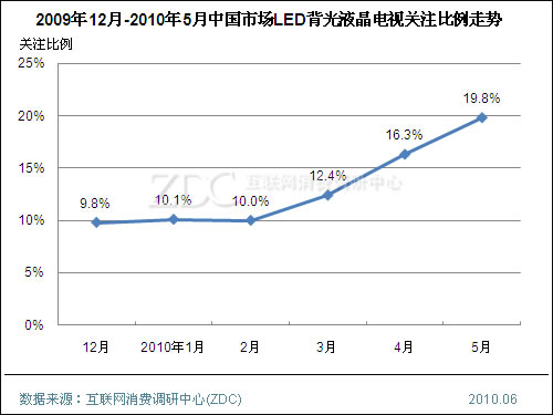 自2009年下半年開始,LED背光液晶電視開始放量增長,各大品牌均提高了LED背光在新品中的應用比例。自2010年3月起,LED背光液晶電視的消費者關注比例開始快速上升,到5月已經(jīng)增加到19.8%,較年初提高近一倍。
