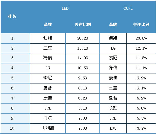 在傳統(tǒng)CCFL背光液晶電視市場中,盡管創(chuàng)維以較大優(yōu)勢領先于其他競爭對手,但LG和索尼等國外品牌的實力不容小覷。尤其是索尼在2010年調(diào)整了對中國市場的策略,推出了一系列低價入門液晶電視,以其品牌號召力以及時尚的外觀設計招徠了數(shù)量不菲的消費者。