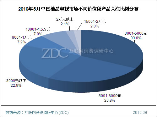 5月,3001-5000元的液晶電視產(chǎn)品吸引了33%的消費者關注度,較上月升高了0.5%,而3000元以下的入門級液晶電視產(chǎn)品吸引了22.9%的消費者關注度,較上月提高了2.6%。而5001-8000元價位段的大中尺寸液晶電視的消費者關注比例較上月減少了4.1%。