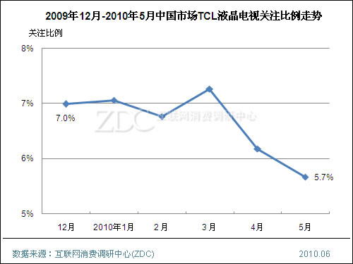2009年,TCL在互聯(lián)網(wǎng)電視領域表現(xiàn)不俗,全年TCL液晶電視全球銷量為842萬臺,同比增長了101%。在2010年第一季度TCL的品牌關注比例走勢平穩(wěn),但4月開始其品牌關注比例有小幅下滑,5月已經(jīng)下滑至5.7%,排名下滑兩位。