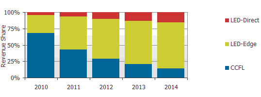 DisplaySearch預(yù)估2010年LED背光液晶電視將占所有液晶電視出貨的20%,大約90%的LED背光液晶電視是使用側(cè)光式背光源。在2011年由于LED零組件供應(yīng)補足且價格下滑,LED背光液晶電視將在2012年成為主要的應(yīng)用技術(shù)。隨著節(jié)能觀念提高與相關(guān)規(guī)定出臺,以及輕薄設(shè)計流行,CCFL到LED背光源液晶電視轉(zhuǎn)換速度將非??焖佟?