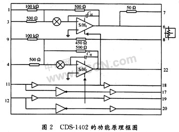 在CCD的應用領(lǐng)域中。相關(guān)雙采樣電路得到了廣泛的應用。很多公司專門研發(fā)了相關(guān)雙采樣的集成電路芯片。這些專用芯片不僅使用方便,且性能也能得到很大的提高。CDS1402芯片是一種典型的相關(guān)雙采樣電路芯片,它是專門為CCD成像器件研制的,用來消除復位噪聲。CDS1402進行了優(yōu)化,適合用于10~14位轉(zhuǎn)換精度的數(shù)字視頻。低噪聲的CDS1402芯片也是利用對高低電平信號的采樣并相減來精確確定視屏信號的。結(jié)果在CCD輸出的浮動電容器上,那些剩余電荷和kTC噪聲被最大限度的消除。CDS1402芯片一共有24個引腳。它包含有2個獨立的采樣保持放大器和S/H電路,每個S/H電路都有獨立的控制線,輸人和輸出管腳,有兩個管腳提供偏置調(diào)流和調(diào)壓。一般來說,CCD的輸出信號都要連接到2個S/H的輸入端,S/H1端用來采集和保持偏置信號,它的輸出值與CCD輸出信號相減,當CCD輸出偏置+視頻信號的時候,S/H2端就進入信號的采集狀態(tài),從而獲得有用的視頻信號。