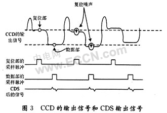 從圖3可以看出,當復位部脈沖是高電平的時候。CCD的輸出信號進行第1次采樣,采樣信號為復位電壓、復位失調(diào)電壓和復位噪聲;當數(shù)據(jù)部脈沖是高電平時,CCD的輸出信號進行第2次采樣,采樣信號除包括復位電壓、復位失調(diào)電壓和復位噪聲外,還包括有用的視頻信號。