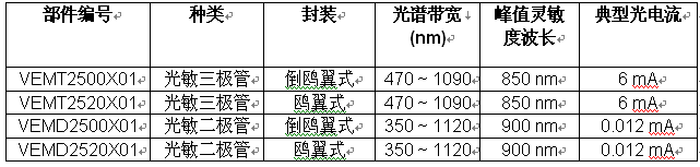 光敏二極管的光電流為12µA,光譜感光范圍為350nm~1120nm,光敏三極管的光電流為6mA,光譜感光范圍470nm~1090nm。VEMD25x0X01和VEMT25x0X01器件的暗電流為1nA,半感光角為±15°,溫度范圍為-40℃~+100℃,可搭配高亮度、高速VSMB20x0X01中的紅外發(fā)射器。