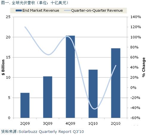 整個(gè)太陽(yáng)能光伏產(chǎn)業(yè)的營(yíng)收在2010年第二季度達(dá)到172億美元,相較于第一季度120億與2009年第二季度62億都有較大的增長(zhǎng)幅度。