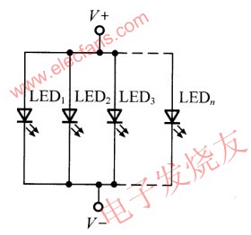 簡(jiǎn)單并聯(lián)形式中的LED1~LEDn首尾并聯(lián),工作時(shí)每個(gè)LED承受的電壓相等。由LED的特性可見(jiàn),其屬于電流型器件,加在LED上的電壓的微小變化都將引起電流的較大變化。此外,由于受到LED制造技術(shù)的限制,即使是同一批次的LED,其性能上的差異也是固有的,因此LED1~LEDn工作時(shí),誰(shuí)過(guò)每個(gè)LED的電流是不相等的。由此可見(jiàn),每個(gè)LED電流分配的不均可能使電流過(guò)大的LED壽命銳減,甚至燒壞。這種連接方式雖然較為簡(jiǎn)單。但是可靠性并不高,特別是對(duì)于LED數(shù)量較多情況下的應(yīng)用就更容易造成使用的故障。