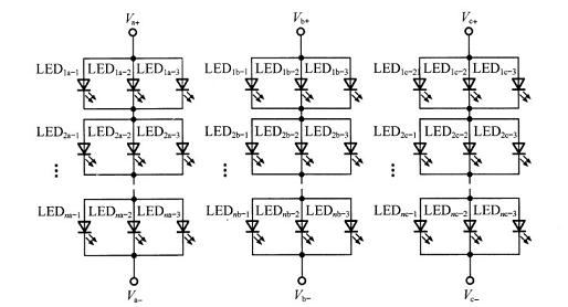 交叉陣列形式主要是為了提高LED工作的可靠性,降低故障率。主要構(gòu)成形式是:每串以3個(gè)LED為一組,分別接入驅(qū)動(dòng)器輸出的Va、Vb、Vc輸出端。當(dāng)一串中的3個(gè)LED都正常時(shí),3個(gè)LED同時(shí)發(fā)光;一旦其中一個(gè)或兩個(gè)LED失效開(kāi)路時(shí),可以保證至少有一個(gè)LED正常工作。這樣一來(lái)就能夠大大地提高每組LED發(fā)光的可靠性,也就能夠提高整個(gè)LED發(fā)光的總體可靠性。