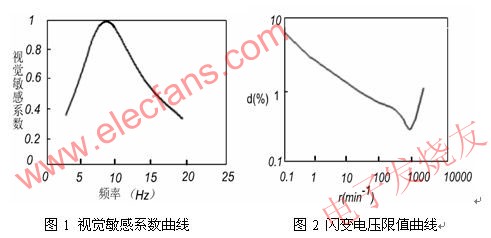 可以被人眼感知的光源閃爍,可以通過統(tǒng)計(jì)的方法來測得人眼的對光源閃爍的感覺特性。圖1是人眼對不同頻率的電壓波動引起的視覺敏感系數(shù)曲線。從曲線上可以看出最敏感的頻率是8.8Hz,偏離該頻率后,敏感度隨頻率而降低。當(dāng)閃爍頻率40Hz以上時(shí),感覺就不靈敏;50Hz以上的閃爍就完全沒有感覺。