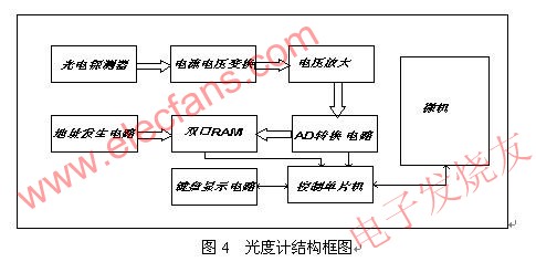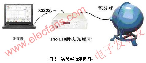 為了精確測量光通量,把光源放在積分球中。經(jīng)過V(λ)校準(zhǔn)的光電探測器接受光信號,其輸出的電信號經(jīng)過放大轉(zhuǎn)換電路,將光電探測器輸出的光電流信號轉(zhuǎn)換成較大的電壓信號,利用AD轉(zhuǎn)換器進(jìn)行采樣。由于單片機(jī)讀取和存儲數(shù)據(jù)速度較慢,故而采用了雙口RAM和地址發(fā)生電路,使得光度計(jì)能夠在采用時(shí)自動對數(shù)據(jù)進(jìn)行存儲。單片機(jī)則在所有采樣過程執(zhí)行完畢后,再從雙口RAM內(nèi)讀取數(shù)據(jù),并發(fā)送給微機(jī)顯示處理。系統(tǒng)結(jié)構(gòu)圖和實(shí)物連接圖如下。