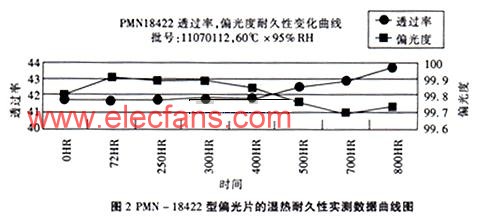 耐濕熱技術(shù)指標(biāo)是指偏光片在恒溫恒濕條件下的耐濕熱工作性能,它也通常分為三個(gè)技術(shù)等級(jí),既通用型:濕熱工作條件為40℃×90%RH×500HR;中耐久型:濕熱工作條件為60℃×90%RH×500HR;高耐久型:濕熱工作條件為:70℃×95%RH×500HR以上。由于構(gòu)成偏光膜的基本材料PVA膜和碘及碘化物都是極易水解的材料,同時(shí)也由于偏光片所使用的壓敏膠在高溫高濕條件下也容易劣化,因此,在偏光片的耐久性技術(shù)指標(biāo)中最重要的就是耐高溫和耐濕熱指標(biāo),如果耐高溫和耐濕熱指標(biāo)通過(guò),其它耐久性型指標(biāo)通常都不會(huì)發(fā)生問(wèn)題。“福地”牌通用型PLN產(chǎn)品和中耐久PMN產(chǎn)品都能夠很好地滿足各自相應(yīng)技術(shù)等級(jí)所規(guī)定的耐久性技術(shù)指標(biāo)的要求(見(jiàn)圖2)。